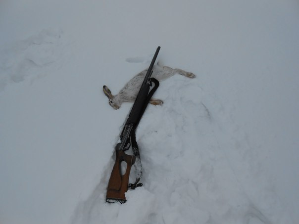 Ездили сегодня. Утром по дороге в угодья-видим метет, но решили проехаться. Кое как пробившись и не найдя следов решили возвращаться,но как это бывает, все-таки заскочили в тихий уголок, где ветра всегда меньше. В итоге нашли след, стали тропить, но заяц перешел дорогу, а там перемело. Немного поискали и прикинув по географии где он может быть разошлись с товарищем проверять. Минут через пять слышу: раз, два, три!!! Третьим выстрелом напарник сразил косого. В 8.50 охота была окончена. Собрались и поехали восвояси, но ближе к дому дернул черт нас заехать еще в один овражек и хоть надежды не было (тем более поблизости завелся очень активный снегоходчик, который вчера забрал зайку раньше нас) поехали искать. Нашли!!! Потропив- я таки вычислил направление, вышел по следу, сдвойка! Вторая! И.... пустая, но теплая после зайки лежка. Слежку ушел в густые, непролазные заросли... 1:1.