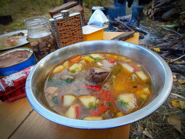 Итак, для приготовления шулюма нам понадобится: 1. Утка (лучше две) 2. Растительное масло(150 гр) 3. Лук репчатый(3 головки) 4. Картофель (6 шт.) 5. Болгарские перцы (2шт) 6. Помидоры (4шт.) 7. Морковь (2шт.) 8. Яблоки (2 шт.) 9. Чеснок (1 головка) 10. Перец Чили (1 стручок) 11. Лавровый лист 12. Зелень (петрушка, укроп, лук) 13. Соль Ставим казан на огонь, даем ему нагреться до высокой температуры. Этим временем потрошенную и опаленную утку рубим на порционные крупные куски. Желательно было бы взять две утки. Если есть время – промыть мясо и дать ему обсохнуть. В казан выливаем растительное масло. Ждем, когда оно раскалиться и начнет трещать. Необходимо следить, чтобы дичь не пригорела, но приобрела золотистую корочку. Периодически помешиваем в течение 20-25 мин. В этот момент слегка подсаливаем мясо. Здесь подсказка – для дальнейшего нам понадобиться 4 литра кипятка, поэтому ставим рядом котелок с водой. Лук чистим, режем крупными полукольцами. Добавляем в блюдо, не забываем мешать. Тут нужна пауза! Если погода ясная и теплая – необходимо пропустить стаканчик пенного, если же хмурая и холодная – то коньячку! Через 10 минут заброса лука шинкуем морковь крупными кружками и все в общий котел ) Режем мелко несколько зубчиков чеснока в казан, остальные нам еще пригодятся. Потушив все вместе 15 минут, вливаем в казан подготовленный кипяток. Костер дальше нужно «запрограммировать» так, чтобы бульон едва кипел, исключая сильное бульканье. Время от времени снимаем пенку. Так как дичи свойственна жесткость мяса, то время кипения до заброса остальных овощей необходимо увеличить – это 30-35 минут. Чищенный картофель режем крупными кубиками и посылаем в бурлящий бульон за 10 минут до помидоров, иначе он плохо провариться. Следующая партия овощей пойдет вся вместе. Сладкие перцы я взял специально разного цвета – для яркости блюда. Их шинкуем крупными полукольцами, яблоки – мелкими кубиками, помидоры – как на салат. Не мельчим – это охотничья кухня! Оставшиеся зубчики чеснока чистим и бросаем целыми. Острый перец Чили в шулюм идет разрезанным пополам. На медленном огне даем покипеть блюду еще 15-20 минут. Добавляем три лавровых листа. Солим. На 6 л у меня ушло 1,5 ст. ложки соли. Остается небольшой штрих – заправить почти готовый шулюм мелко нарубленной зеленью и потомить пять минут под крышкой! Шулюм готов! Накрываем стол, созываем товарищей! Приятного аппетита! |