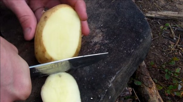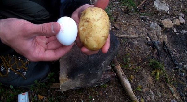 ЯЙЦО В КАРТОФЕЛЕ Картофелина и куриное яйцо. Все готовится в полевых условиях, на костре. Точнее на раскаленных углях. Давайте по порядку: Берем чистую сырую картофелину и срезаем вдоль нее краешек. Далее берем ложку и при помощи нее, вырезаем сердцевину картофелины. Теперь самое интересное: берем яйцо, разбиваем и выливаем в картофелину. Затем, очередь крышечки. Берем спички и втыкаем в нее. Ну вот: готово. Берем наше «блюдо» и ставим на угли. Ждем около 20 минут. Блюдо приготовилось. Можно подавать на стол. Осторожно срезаем крышечку ножом. Вуаля! Приятного аппетита! |
