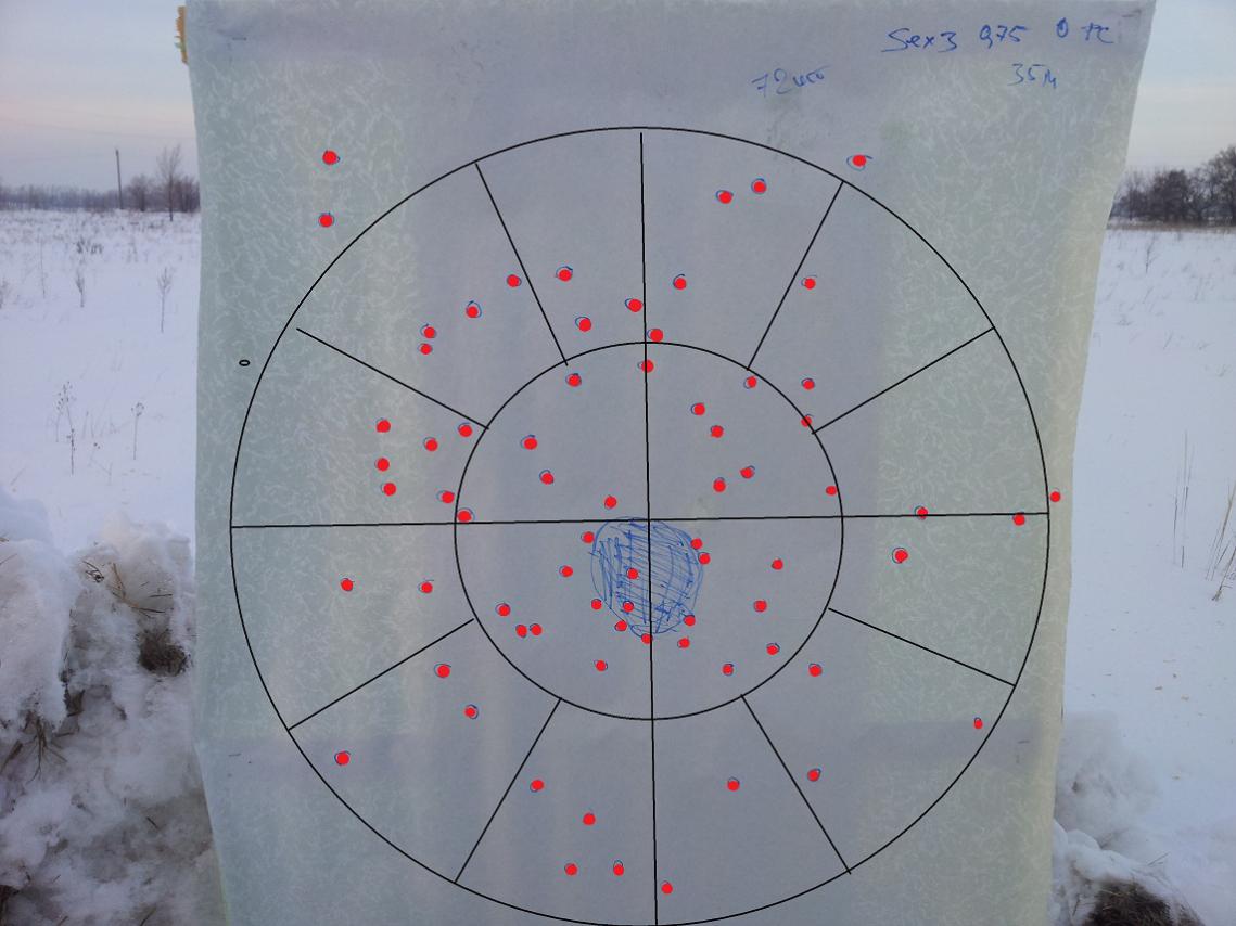 Вот пришли первые тестовые результаты, предоставленные Варягом, патрона, собранного: гильза Азот (12/76), капсюль сх2000, порох МВ36 1,84гр, обтюратор резанный от Биора Феттер Н18, пыжи Диана Н8 + пробка Н6, контейнер от П/К Н10 от ГП. дробь №0(Бийск) 36гр (78шт) +0,7гр пробковый буфер, звезда с подкруткой (Гаеп BN4)