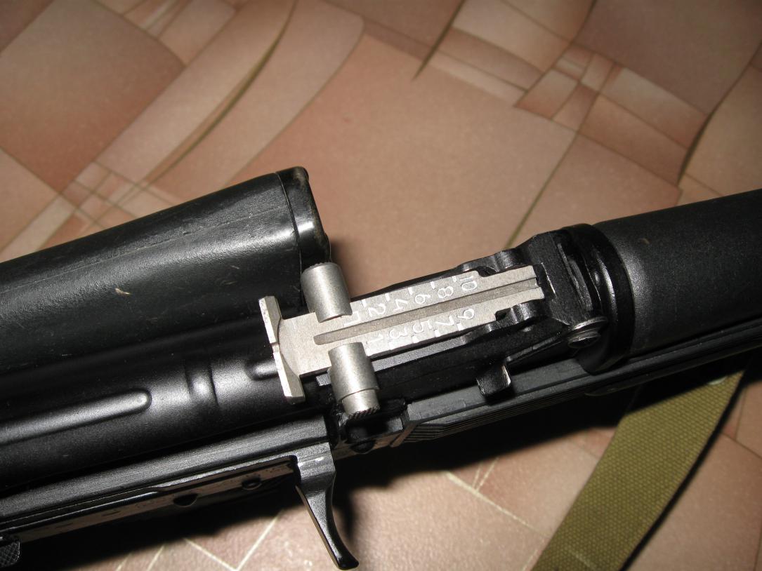 Установлена ребристая крышка от АК-74 с возвратной пружиной, переходник под магазины АК-74, прицельная планка на 1000 м, кастомный ДТК.