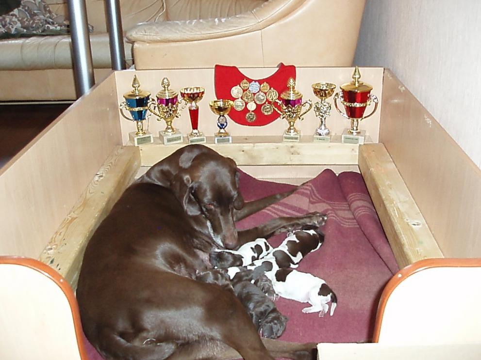 В помете 6 щенков: 2 кобеля (кофейный и кофейный в крапе) и 4 суки (1 кофейная и 3 кофейные в крапе).