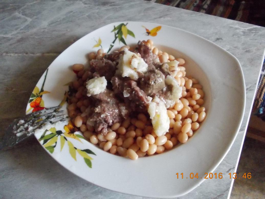 Ну вот наконец созрел......приобрел в магазине банку белой фасоли СКЗ "БОБОВИЧ" - 40 руб.(красной не нашел)...фасолины находятся в прозрачном "тягучем" сиропе, все фасолины как одна к одному...красивые...стройные....глаз радуется....на вкус чуть жестковатые (может белая такой сорт) но очень вкусные,не горькие...никаких лишних вкусов нет! И так-же приобрел тушенку говяжью, про-ва Ермолинского МК, цена 115 руб.(была там свинина,но пока про говядину) запах как у армейской...все в норме, жирок присутствует....но немного....мясо в "натуре" кусками.....вкус и цвет соответственно....на отлично...мне показалось что даже очень похожа на "армейскую" и лучше белорусской....но это сугубо мое мнение.... жилы и всякие лишние включения отсутствуют... Вот как-то такое блюдо соорудил (котэ чуть не сперла) и.......банка тушенки для двоих выше крыши..полноценный перекус на-двоих за 155 руб....ДОСТОЙНО.... пробуйте....думаю не пожалеете...