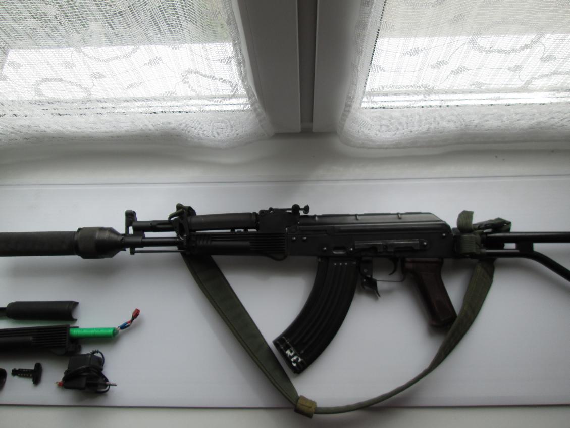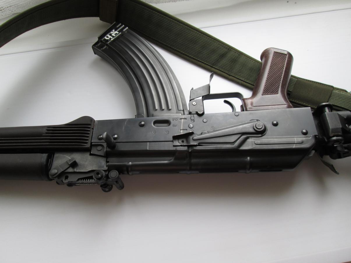 Установлена настоящая газоотводная трубка с накладкой слива, цевьё слива. Кольцо цевья с антабкой. В комплекте родные чёрные. Приклад такой стоял, не знаю от чего он. Откидывается в право, если ставить муляж оптики то очень удобно. В комплекте муляж ПБС-1 изготовлен из металла , планка для ПБС-1 настоящая. Колодка мушки, шомпол и ствол всё прикручено доп. винтами. Всё собрано без люфтов, ни где не чего не болтается.