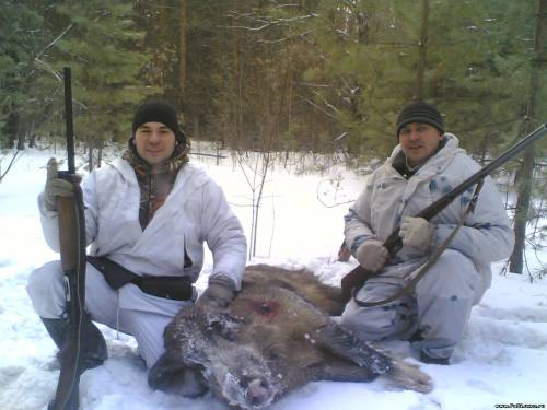 Всем привет, вот и наша компания пополнилась выездом по капыту-вообщем все по порядку, звонит мне Ринат 03.01.11 в 21 час примерно и говорит что завтра т.е. 04.01.11 едем на трофейного кабана (лицензию мы выиграли на областном турнире охотников в прошлом году-кто был тот помнит) решаю собираться, проверяю пулевые патроны вообщем все как положено! Выезжаем в 6.30 из СХИ и направляемся в м.малышевку там нас уже ждут наши друзья!Подъезжаем, здороваемся, курим, дожидаемся еще двух парней с лайкой, ну наконец то все в сборе садимся в УАЗик и ниву и спешим к егерю!Егерь уже был собран ну не очень доволен нашим приездом все приговаривал что достали уже ездить на охоту к нему, и типа лес ему уже сниться ну это настроение нам не портило впереди у нас был день охоты и общения с друзьями! Объезжаем лесной остров находим входной след решаем выставлять номера 6 человек встали на противоположной дороге один номер встает на входном следе! Стою на номере вдруг слышу как лайка залилась азартным лаем значит зверь все таки в острове лай приближался все ближе и ближе вдруг слышу лай стал удаляться, прозвучал одиночный выстрел!Тут Ринат звонит с соседнего номера и говорит что кабан вышел неподалеку от входного следа, охотник стрелял ну видно не фартануло! Садимся по машинам, и начались покатушки с егерем, с каждым часом надежды на трофей не оставалось тут находим два входных следа в остров и один выходной решаем попытать счастье второй раз встаем по номерам- произошло все быстро номерам пришлось подстроиться под собаку бегом, звучит 2 выстрела и пронзительный голос- ДОШЕЛ!!!Подбегаю секач лежит смертельное ранение в шею!ну потом все было по накатанной грам по 200 боевых, жаренная печень с картошечкой, и веселая дорога домой с песнями и байками! фотку позже выложу
