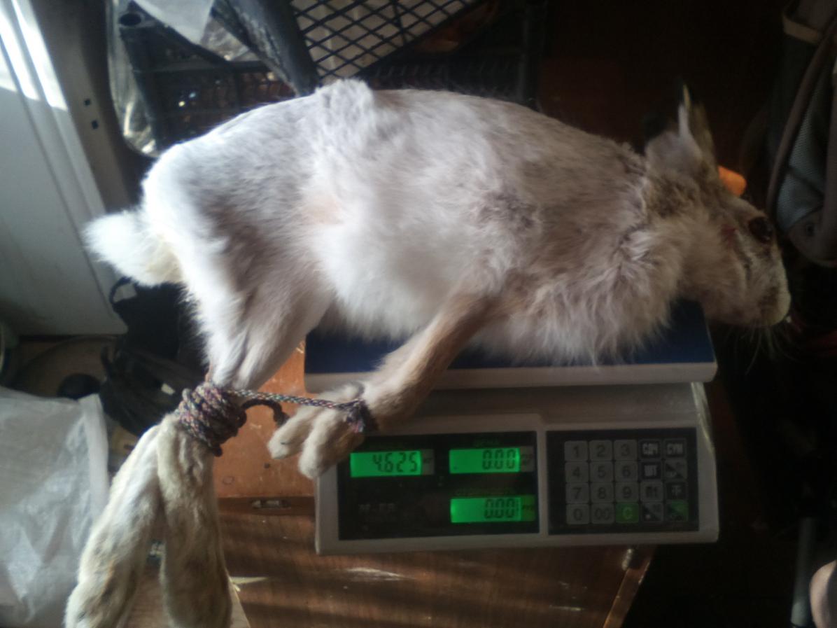 16.02 погода: ветер до 9-10м/с. Следы свежие возле посадки, но в 80 метрах от нее все заметено. Решили пройтись вдоль посадки. Посадка- два ряда редко растущих берез. Идем, смотрим под стволами наддувы. И вдруг, не верю своим глазам, внутри посадки, от меня в 40 метрах, стоит ГУСЬ НА КРАСНЫХ ЛАПАХ! Я остолбенел! Глазам не верю и по рации говорю свояку : " Впереди стоит гусь". А в голове вертится, если домашний, как сюда попал (больше 1км от села), или все-таки ЛЕБЕДЬ! А эта красота стоит ко мне в вполоборота и не двигается. Стали к нему идти. Гусь-лебедь сделал шажок, оттолкнулся и полетел. Свояк говорит, что полетел в сторону села. Вот так охота на зайца!!! А 17.02 погода- супер! Таких дней за зиму было не много. Следов тьма. Зайцы гоняются за зайчихами и дерутся. Клочки шерсти валяются на местах БИТВ. Лежку, нору, вырытую в снегу между травяными кустиками, нашел через 2,5 часа. С лежки он и встал, подпустив на 10 метров. Вес зайца под 6кг. Именно заяц, не зайчиха. Свои разрешения закрыл. В другом о/х подняли еще одного зайца, но я шел по его следам в небольшой рощице, и его не видел, а свояк сказал, что от него встал далеко.