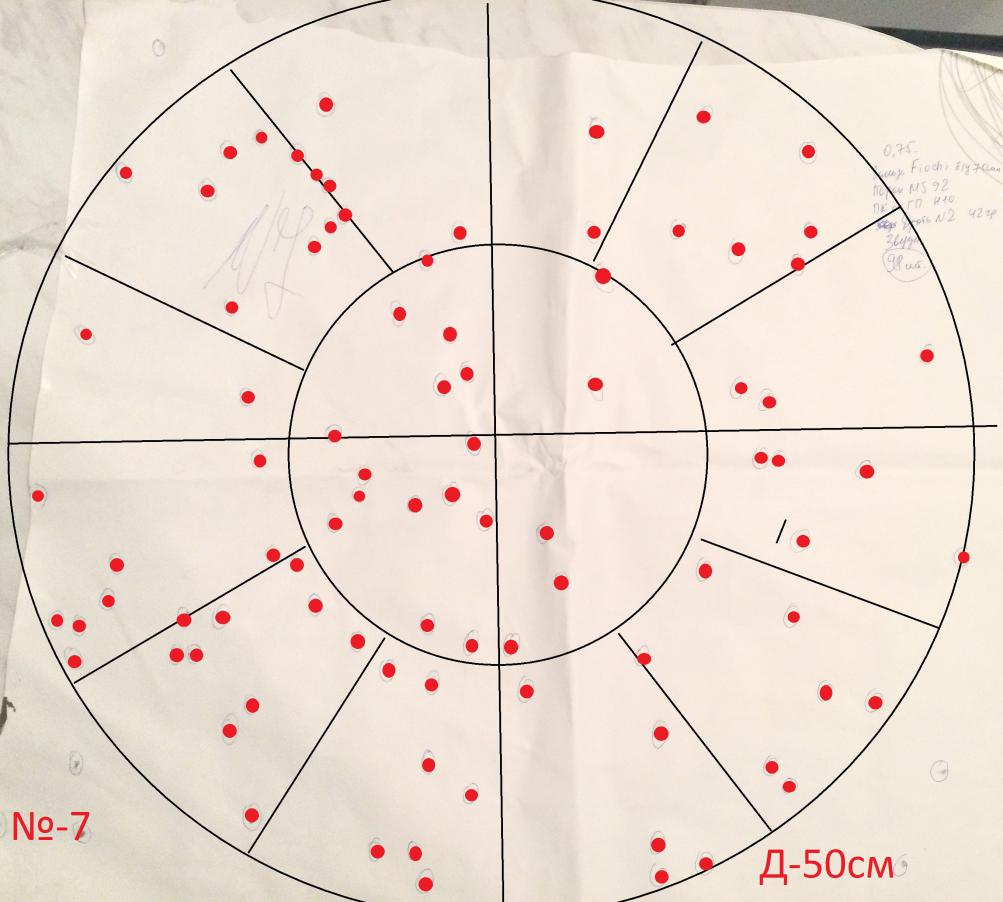Вот отредактировал мишеньку от Егора (Варяг), результат теста патрона дробь 34г. №2 (109шт.) и собранного на порохе Драго (Нобель). В мишени диам. 750мм, 90шт дробин.