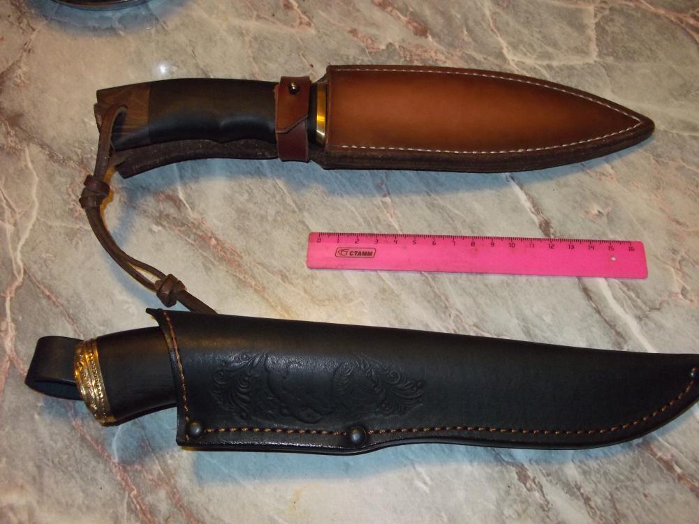 1.Предлагаю вашему вниманию вариант боевого ножа «Каратель» в исполнении без гарды с клинком из кованой углеродистой пружинно- рессорной стали 65Г. Подобные ножи "Каратель" и "Взмах" используются спецподразделениями МВД и ФСБ для работы в тяжелых условиях. Антибликовое покрытие клинка (оксидирование), заточка низ и верхняя передняя часть. Сталь 65Г применяется для изготовления пружин, рессор, корпусов подшипников и обладает достаточно высокой жесткостью и способностью долго сохранять заточку. Исполнение рукояти - комбинация черного граба, гарда латунь. Соединение клинка и рукояти- шпилька диаметром 8 мм до конца рукояти. Этот нож является сделанным вручную высококачественным изделием, которое может украсить любую коллекцию, и может использоваться для охоты, туризма, рыбалки, походов по местам сражений! Made in VORSMA. Не стоит сравнивать этот качественный нож с китайскими «аналогами» из чугуна, покрытыми укрепляющим напылением! Цена пусть-4.500 руб. Характеристики ножа: Сталь пружинно-рессорная 65Г. Общая длина 289 мм Длина клинка 165 мм Ширина клинка 35 мм Толщина клинка 5,8 мм Твердость клинка (HRC) 60-61 ед. Рукоять: латунь, черный граб. Ножны от мастерской "Романа Серкова" 2.Охотничий нож «Шерхан» дамаск. Ручная работа! Черный граб, латунь, герб РФ! Новый охотничий нож «Шерхан» с клинком из кованой дамасской стали.Дамаск имеет великолепные режущие свойства. Рисунок дамаска – «крученый». Кузнец Новоселов. На клинке имеется клеймо. Элементы рукояти выполнены методом литья из латуни, задняя часть - герб России, дерево- черный граб. Соединение клинка и рукояти – шпилька диаметром 8 мм до конца рукояти. Сделано в г. Ворсма, полностью ручная ковка и работа. Ножны из натуральной кожи с тиснением в комплекте.Цена пусть-4.000 руб. Характеристики ножа: Сталь дамасская, пакет ШХ15+ХВГ+У8. Общая длина 270 мм Длина клинка 148 мм Ширина клинка 35 мм Толщина клинка 3,4 мм Твердость клинка (HRC) 59-60 ед. Рукоять: литье латунь, черный граб. Прошу звонить по тел.+семь 927 205 шесть 118 Сергей. Если не беру или сбрасываю-перезвоню сам (не всегда есть возможность разговаривать). Спасибо за понимание. На форуме после 20-00.Но лучше звоните.