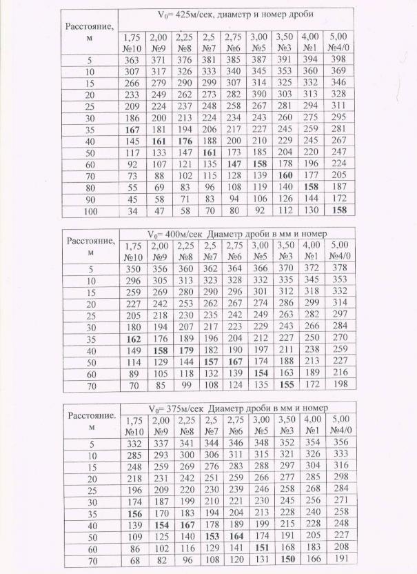 Интересная таблица для самоснаряжающих (и не только). Жирным выделена предельная минимальная скорость дроби на определенной дистанции, на которой она сохраняет энергию для поражения дичи.