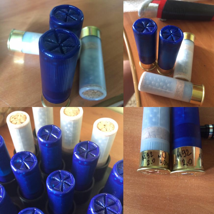 №2. Гильза Чедит 70, капсуль СХ2000, Порох М92S 2,0 гр., абтюратор от БИОРа, Пробка Н8, стаканчик Рязань 40 грамм, Дробь №0 40 гр (87 дробин), пробка Н4, Закрутка. Ни че так патроны получились, но отстрелять не получится... Только после Саратова!