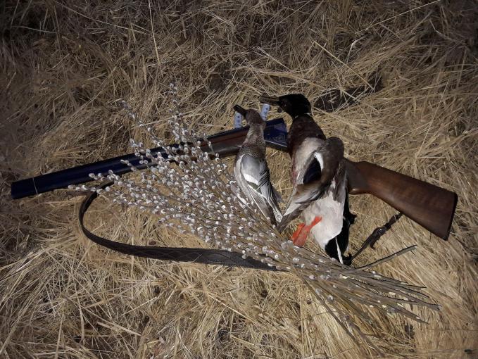 Прибыли на место 8.04.17, приблизительно в 6:30. На подъезде, радовали глаз стаи утей. Поздоровались с друзьями, попили чайку, собрали чучела, серп, топорик и двинули готовить шалаши. Озера во льду, нашли приличную лужу с талой водой и принялись за дело. Почикали руки камышом, натаскали сухостоя, соорудили шалашик, раскидали чучалки, а время уж десятый час, но решили посидеть минут 20. Я со старшим в одном скрадке, а младший метров за 50. манил как мог и минут через пять, над нами просвистел красавиц Селезень. Настроение поднялось, мандраж по телу, но я не останавливаюсь и маню изо всех сил. то ли этот же товарищ, то ли другой, минут через 10 вылетает не замечая нас несется метрах в пятнадцати, три выстрела, я мажу, но брат исправил мою ошибку и он расставив крылья, опустив лапки вниз, медленно плюхнулся в лужу!!!! ( первый раз видел такое падение, красота) Забрали этого красавца и пошли в лагерь кушать.