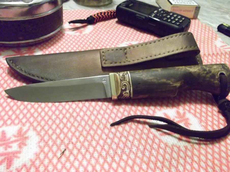 Ножны сшиты вручную (кожа-"фанера"), рукоять-березовый кап,гарда-латунь,рог лося,темляк.Заточка-бритва.Нож разработан,изготовлен и собран Романом Серковым ("мастерская Романа Серкова" г.Самара). Вашему вниманию....тот маленький клин...и воот он результат...ручная работа Романа Серкова...