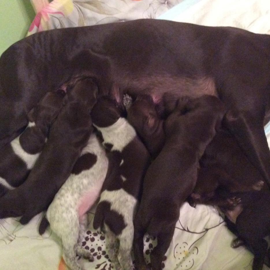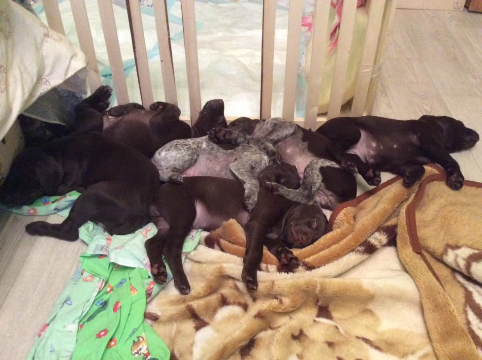 В помете 7щенков: 1 кобель и 6 сук. Зарезервировано 2 щенка. Свободны: 1 кофейный кобель, 1 сука в крапе, 3 суки кофейные.
