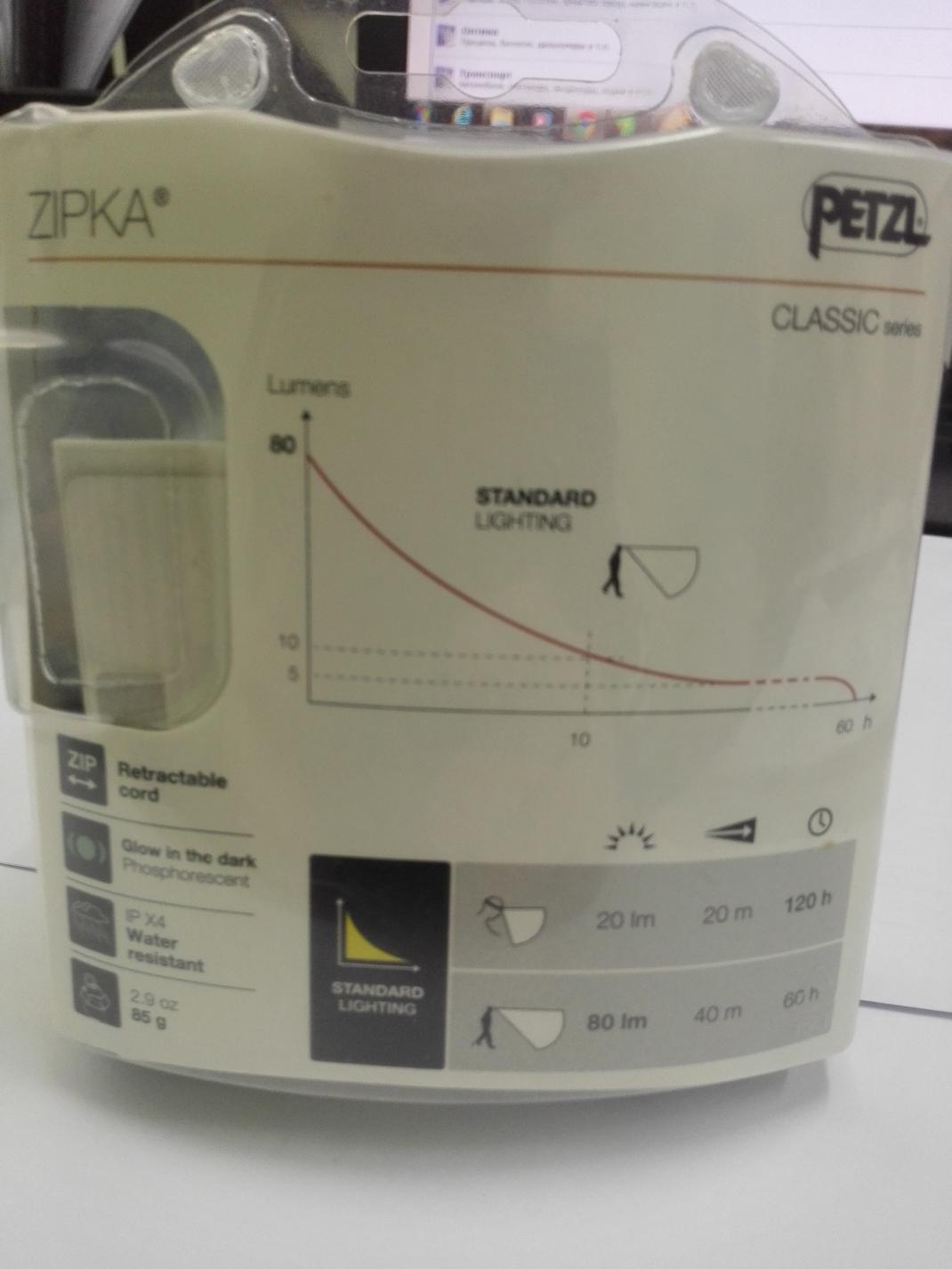 PETZL ZIPKA два режима 80lm и 20lm,питание ААА 3шт. батареек хватает очень на долго.Влагозащита IP X4, удобное вытяжное крепление на голову. цена 1т.р. 8927-206-66-47 Максим