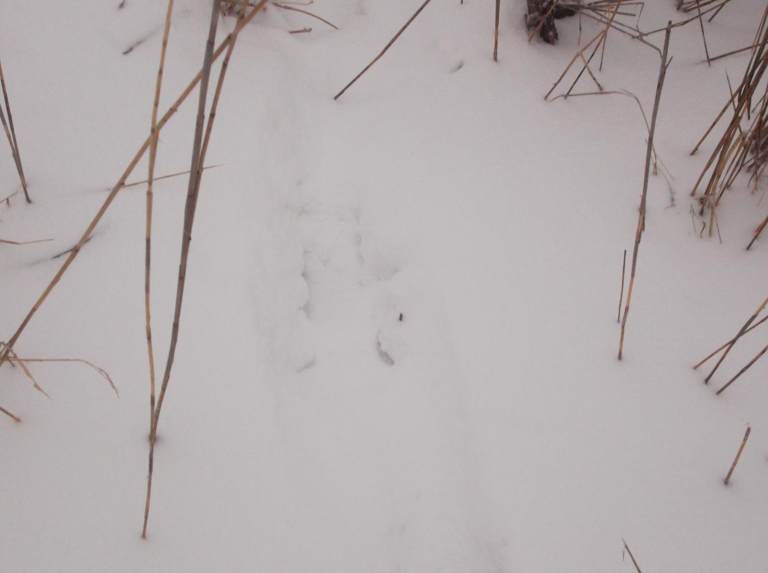 В прошедшую пятницу 2 часа гонялся за зайцем по джунглям из осоки. След из поля привёл меня к озеру. Скидка была прямо в заросли. Поднялся он от меня в 5-7 метрах, но я его не вижу а только слышу как тростник хрустит. Спрыгиваю с лыж и за ушастым в дебри. Пробираться сложно ,но и заю не легко , он не скачет а ползёт. На открытое место вылезет и метров через 100-150 опять в джунгли. Намотали так мы с ним км3-4 и я сдался. Я этого кустодрота так даже и не увидел воочию, хотя был впереди меня все время не далеко. Умотал он меня так ,что до машины я еле доплёлся. Сегодня решил его навестить. Из дома выехал в 7-45. Погодка чудная. Но в 8-00 снег как будто включили. Следы все позасыпало.Зайчика я не нашёл, зато увидел два ночных следа от хрюнов. Судя по копытам -не мелкие. Как то очково стало лазить по этим местам с 1 в стволе, да и снег валит . Решил возвращаться домой. В следущий раз зайца навещу.