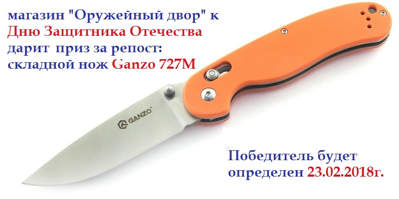 Складной нож Ganzo 727M-OR достанется случайному подписчику нашей группы. Условия розыгрыша: 1. Быть подписчиком группы 2. Закрепить данное сообщение на стене своей страницы 3 Сохранять данное сообщение до окончания розыгрыша. Победитель будет определен с помощью специального приложения 23.02.2018г. |