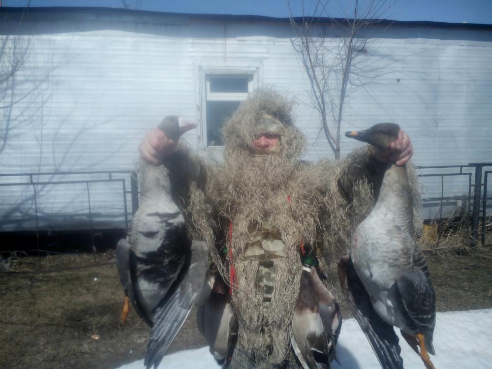 Сразу объясню почему без маскировки практически-в бинокль оценили обстановку и решили использовать белый укрывной материал, но спустя какое то время поняли - пугает гуся, пришлось убрать! А до лагеря 5 км, чет никто не захотел бежать за сетками и т.д. , а потом взяли свое и уже просто балдели, манили, кружили, иногда стреляли.