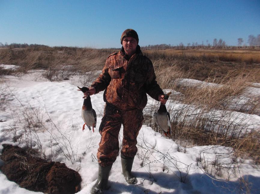 С 14 по 16 открывался в БГ районе. 13.04. гусь голов 500 сидел в кукурузе. Но так как конкуренция была большая ( погодка мать её) мы расставились в стерне в 1 км. от кукурузы. Стали ждать рассвета. Но в 4 часа у кого то душонка не вытерпела и эти тела стали подкрадываться к гусям . Естественно гуси не такие дебилы, что бы сидеть и ждать пока их за шею хватать начнут. Всё стадо поднялось и по тёмному свалило в неизвестном направлении. Всё что можно было выразить в тот момент у меня вырвалось одним словом- ПИД....Ы. В ночи слышно было долеко. А с рассветом и далее днём и на вечёрках гусь весь (редкими стайками) летел высоко и на призывы манков не реагировал. Лишь на второй день наманил пару гуменников. Но от большого желания добыть птицу промазал с30-40 метров сделав 3 выстрела. А брат вообще от волнения не снял с предохранителя, и отсалютовал уже в догонку. Больше по гусям стрелать не пришлось. По сравнению с прошлым годом гуся в разы меньше и летит в основном транзитом. Зато ути как грязи. Охотился на них два раза в обед между гусиными зорьками-вечёрками. Кидал в ручей шириной 2 метра резиновую утку привязанную на 10 метровую леску.Уточку течением мотало от берега к берегу- выглядело как будто она плавает. Ну и крякал в Настю2. В итоге в день по 2 селезня. Правда одного селешка у меня спёр какой то зверь. После добычи первого селезня была долгая пауза и мне стало скучновато и я решил прогуляться вниз по ручью в поиске нового места. Таскать в руках добычу было не охота, и я прикопал селесня в снег. Ходил я с полчаса,но за это время от ути остались на снегу лежать пёрышки и какашка походу от лисы. В итоге домой привёз только троих селезней. Постараюсь в пятницу ещё раз попытать гусика. А вдруг повезёт.