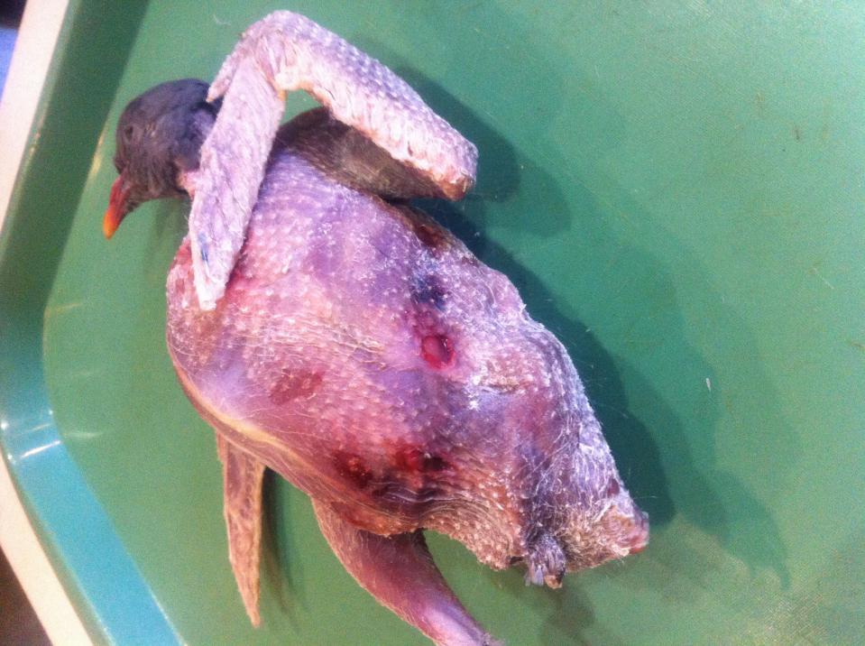 Намедни добыл вяхиря, бит был над водой, собака подала у меня на виду. Смотрю у голубя нет лапки, думаю когда успела, на плаву отгрызть? Дома ощипал, нет не только лапки, но и окорока с бедром, все обтянуто кожей и никаких шрамов. Вот такой вот мутант.