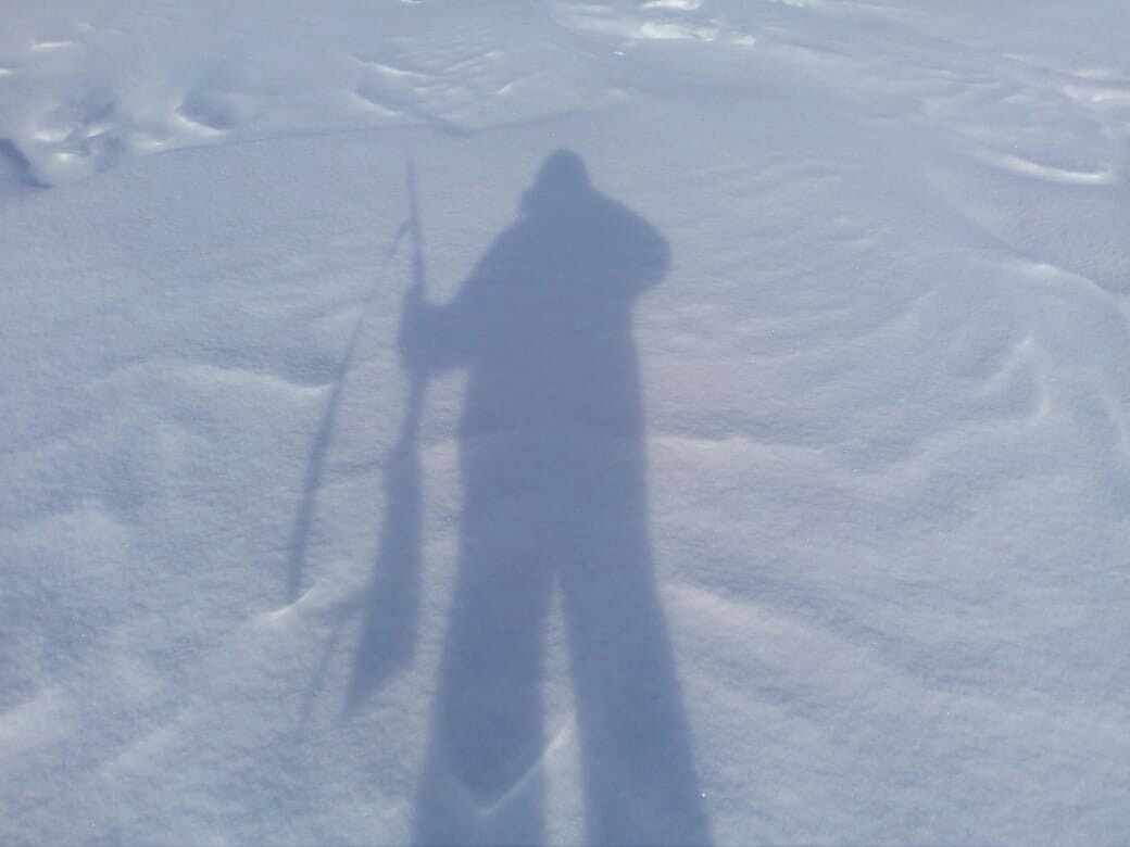 Утеплился, нацепил обмундирование, лыжи, ружье и пополз по снегу. Снега в полях очень много,давно такого не было. Когда случались падения(куда без них), проваливался местами по самые помидоры и потом барахтался как жук т.к. твердой опоры нет. След зайца был у села и в сторону села, в селе искать не стал, пошел против следа, так для ориентира и ознакомления. Зай шел ровно в село вдоль оврага с небольшими петлями и играми.