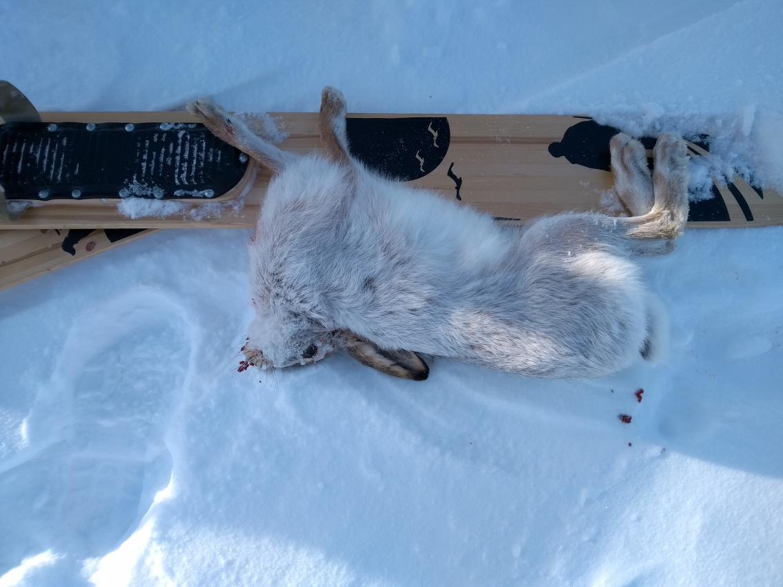 Так как я стоял на лыжах лицом в другую сторону и не мог шевелиться пока зай бежит, пришлось выпрыгивать из лыж, целиться и стрелять одновременно!! В момент выстрела - провалился в глубокий снег ногой.. Эххххх