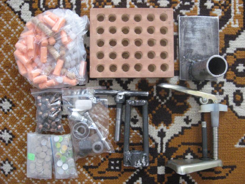 Гильзы короткие "ТЕХКРИМ"однострел(53шт.) для "АК" магазина, калиброванные, декапсулированные - 4р./шт. Гильзы "БПЗ" однострел (90шт.)-4р./шт. Дробовой пыж-контейнер для пластика(70шт.)-100р. Набор для снаряжения УПС-5 с адаптером под 410кал.+завальцовочное кольцо(2шт.), калибровочное кольцо,воронка, шток, закрутка(самодельная, работает очень хорошо),немного пуль ПМ, различные пыжы, подставка. -2500р. |