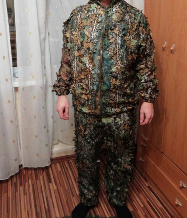 У меня лет 10 уже костюм лешего синтетический,ничего не весит,ни шуршит,не цепляется.Садишься на бережке,утки к ногам подлетают)))