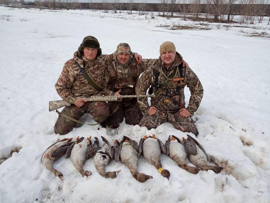 Выехали в четверг в 22-00, т.к. путевки не брали, на разведку не ездили. Итого сутки на поиски и пара дней охоты. В Пугачеве были уже в 03-00, оставили одного товарища на получение путевок и на двух машинах рванули в разные стороны на поиски Гуся! Лет начался в 09-00, везде, но мало. Гусь летел на Юг и Север. Половина полей в снегу, половина сухая. Параллельный коллектив обнаружил периодический пролет в соседнем районе, рвем к ним в поисках кормового поля… Позже приехал товарищ с путевками и начались мотания по полям… Побуксовали, покопали, поматерились – поля кормового нет))))))). В итоге разместились на поле с озимыми и снегом, там, где был замечен более системный, что ли пролет. В ночь расставились. Приняли решение идти без скрадков и маскироваться в снегу… В 05-00 уже были на месте в белых маскхалатах, гуся нет… 06-00 – гуся нет. 07-00 вдалеке слышится гогот, а может галюцинации. Сидим, дуем в манки – ноль… Прямо расстроились! В 08-00 почти на горизонте замечаем одиночку, маним, снижается, прет на чучела и прямо к нам в лоб, бьем – падает! Ииииес! «Распечатали» сезон 2019г!!! Поздравляем с полем товарища. И опять тишина. К 9-00 появился туман и он, думается, сделал всю охоту, ну и друг который разработал план сегодняшней охоты – гусь полетел и летел низко. Снег стал яростно таять и оказались мы жиже грязи и воды ))). Несколько налетов и с удручающей все немыслимые границы стрельбой мы вырвали свои 7 гусей на троих. Далее лагерь и несколько фото на память. Далее была вечерка и один добытый гусь в сумерках. На утрянке 07.04. добыли еще двух красавцев! Все, домой! Отличившихся с полем, остальным ни пуха, ни пера! |