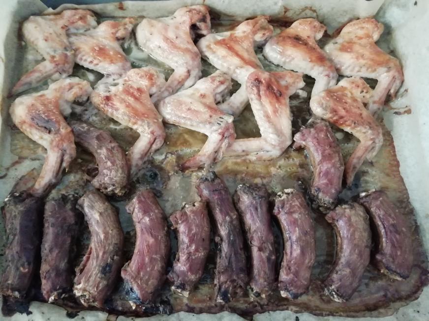 В итоге взял на заметку готовить по отдельности, да и шеи индейки более интересны по количеству мяса. Так же шеи мальца подсушились, а крылья из-за сливочного соуса не пришпарились корочкой. Ну или нужно на разных противнях - крылья выше к грилю, шеи ниже.