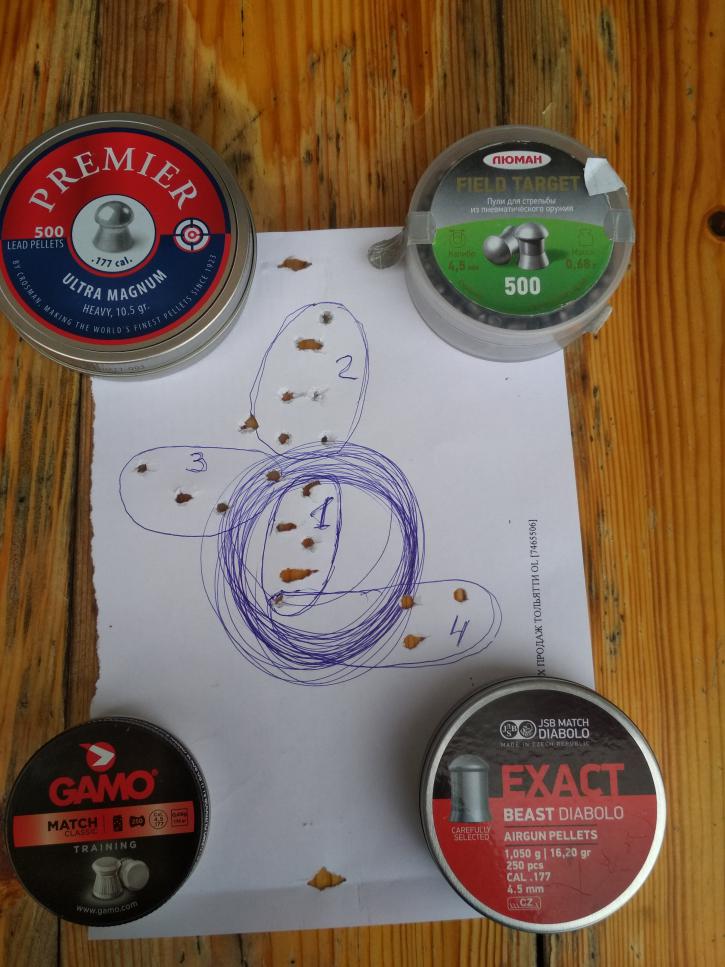 Чесслово надоело держать винтовку в девственном состоянии неизвестно для чего и для кого)). Несколько человек выразили желание забрать ее, но по-тихому пропали, даже не отказавшись. Мне такое отношение не по душе. Пора вводить железку в эксплуатацию и получать удовольствие. Вот и результат сегодняшнего самоизолированного утра. То что тяжелые пули летят ниже, а легкие выше - это понятно. Но интересно, что тяжелые левее, а легкие правее. Это просто придется принять. Кучность мож и нормальная для ППП. 30м с подушки. Писипи на такой дистанции в 2 рубля уложится. Мож и эта показала бы себя лучше с оптикой. Мушка на дистанции толще кругляша, но что есть, то есть. И так пойдет.