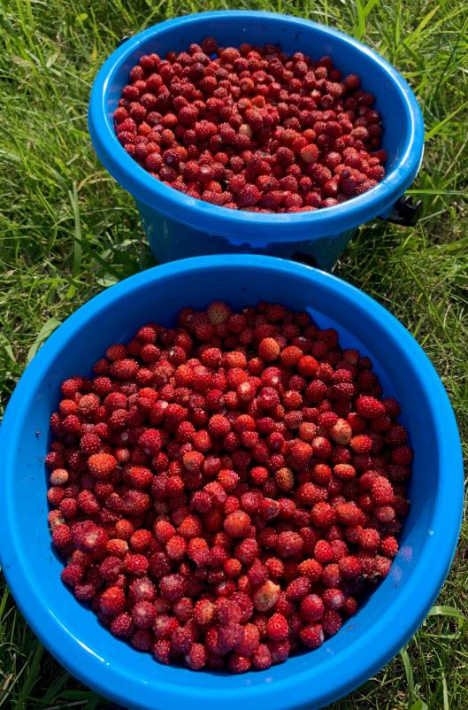 Земляники в этом году просто невероятно много. Везде . В прошлом году, осенью, ставил капканы ,увидел земляничник, место приметил . Три дня назад нарвал по дороге на пляж с ведро, а больше мне и не нужно, так как урожай домашней клубники тоже удался..да и вообще ягоды море...сначала жимолость, клубника, сейчас малина... вишни очень много...абрикосы набирают вес...боюсь морозилок не хватит