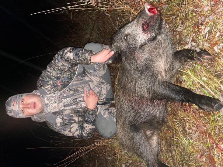 Первый снег 2020г. «Лех, снег… поехали», Ваня был не приклонен. Непогода – надо ехать в угодья! Приехали после работы, уже темно. Едем смотрим косули бегают, на окраинах все, красиво. Первую вышку проехали, вторую… Как то все внезапно, как обычно с кабанами… Смотрим идут. Свинья, три няньки (покрупнее) и сеголетки разных размеров, голов 8. Спокойно по травке шарахаются. Мы опешили, только курили сидели, болтали, ждали то попозже… Метров 170. Смотрим, целимся, идут слева направо. На чистое и для выстрела, примерно выйдут метрах в 130. «Твой третий, мой 4, только сеголетков». ОК. Вдруг свинья начала «пылесосить» воздух - многие слышали этот звук, когда свинья, мать, задирает морду к верху и вращая ей в стороны нюхает территорию, для определения инородных существ, типа человек… которые являются реальной опасностью для ее потомства. Планы стрельнуть на первоначальном месте естественно провалились, надо стрелять сейчас, на чуть дальней дистанции и немного в траве. Запомнил какой твой и в момент «на три - раз, два, три» стреляешь. Чего казалось бы проще… Все так, но когда охотника 2 и они находятся рядом, тяжело считать идущего зверя, кто то видит левого, кто то вдалеке другого… В этот раз было именно так. Оба выстрела громыхнули почти одновременно и было слышно два шлепка – прям как будто в ладоши кто то вдалеке хлопнул. Кабаны бросились за матерью и няньками и через 10 секунд их уже не было видно… Лежит кабан! А где второй, ну тот, что был 3-м или 4-м? Промах чей то. Наверное промах. Но шлепков было два, оба слышали. Спустились, подошли, лежит кабаненок, сеголеток жирненький. Два четких отверстия и из них пар остывающего зверя… А вокруг идет снег, легкий морозец, воздух свежий-свежий… Красота! С полем, Ваня, С полем, Леша! Посмеялись друг над другом и на базу…