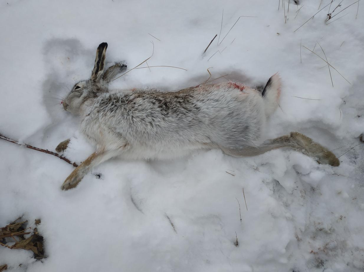Минувшие кульбиты данного экземпляра не давали покоя. Сон нарушился и думы были всякие. Какие тактические ходы предпринять...но буду краток ибо охота была скоротечна то есть "Охота по Кольту" (по "Косому" в другой истории может быть ( выстрел был один)) и на задах деревни...все прям как он описывает.))))). Снега немного сыпануло, но недостаточно и позавчерашние следы было видно, но то что они стары, легко узнавалось. Выйдя на территорию матёрого зайца были обнаружены пару человеческих следов.."залетные охотники" прошлись утром пытались торопить зайца по кормежке, натоптали не меньше чем зайцы и ушли прочь. Я же пройдя по отвалу с которого стрелял предыдущего зайца зацепил гонный свежий след, причем было понятно что это именно он, так как шел он к себе "домой"! Видно он объегорил утренних топтунов, дал круг и восвояси...где по укатанному собаками и людьми снегу его найти нереально.
