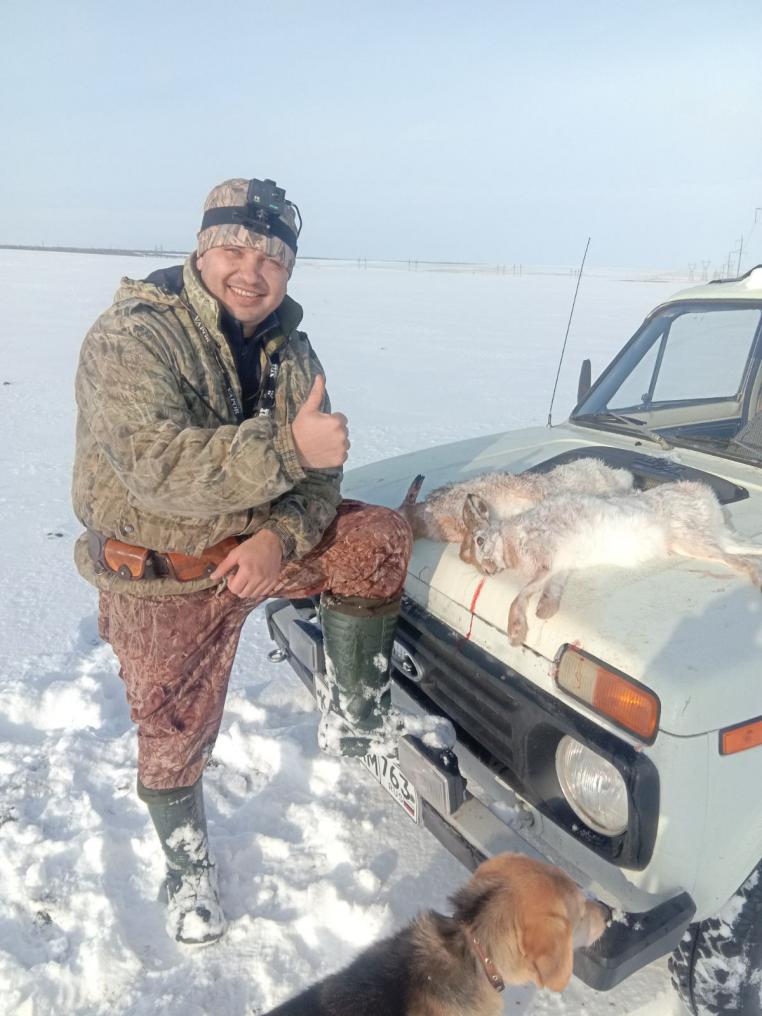 Приехав на место, настроение совсем упало - следов нет. Решаем заглянуть в овражек, где в прошлом сезоне матёрый косой два раза меня обдурил. Но в овраге косой не решился залечь. Пока я ходил прочесывать ещё одну лощинку, Денис набрёл на утренний след и сразу скидка. Идём тропить: настроение заметно поднялось. А вот и вздвойка, скидка, ещё одна и ещё. А вот и заяц- лежит в ковыле, соорудив там себе лежку, смотрит на нас, а мы на его. И тут нервы у него не выдерживают. Прозвучали выстрелы и заяц пал, не пробежав и 15ти шагов. Идём к машине и по догоге замечаю еле заметную скидку. Начинаем распутывать. Но натыкаемся на гонный след. Ага: имеем дело с профессором. Решаем его погонять. Я с молодым выжлецом по следу, а товарища отправляю на номер. Часа два его гоняли и скидок он понаделал и водил меня туда-сюда. Удавалось ему меня обхитрить и показывался и терялся из поле зрения. Но и мне удалось развернуть его на номер. Немного он до стрелка не дошел. Скинулся в посадку на другую сторону. Хотел меня пропустить. Но что-то меня сподвигло перейти посадку. Только першел- подъем, выстрелы через посадку, заяц выскочил на дорогу и побежал в обратную сторону. Косой пробежал метров 300 и скинулся в посадку. И на следу была крупинка крови. Всё, надо добирать. Много писать не буду: в итоге удалось его обратно толкнуть на номер. Денис уверенно сделал свое дело. Подранок добран. Ещё один профессор пал. 2:0 норма.