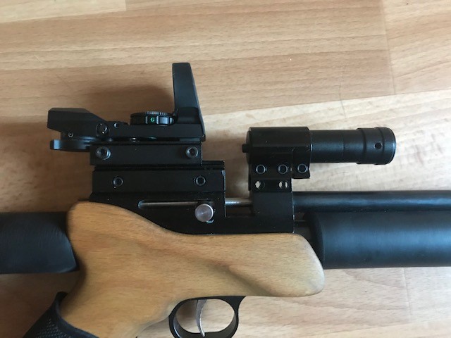 Продам пистолет Titan CP1 (он же Kandar, Strike One) кал. 5,5.. Заменен ствол на 300 мм, съемный складной приклад, съемный саундмодератор, коллиматорный прицел и лазерный целеуказатель. Работает на СО2. При необходимости легко переделывается в РСР с помощью китов. Скорость не мерял. Стреляет отлично.