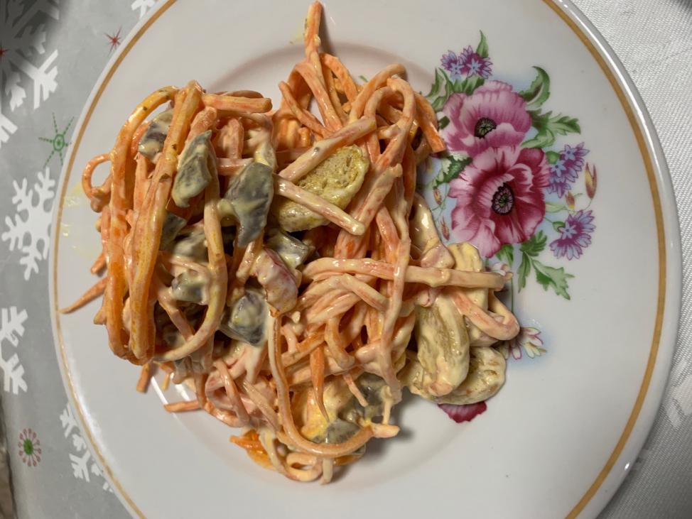 Сердце лося большое, его хватает на несколько готовок нескольких блюд. Так как в конце года добыл лося я, сердце досталось мне! А теперь внимание блюдо из сердца – САЛАТ. 1. Отвариваем сердце – минут 20 после закипания (соль, лук, перчик и лаврушка). 2. Морковь по корейски куплена в магазине. 3. Сухарики и болгарский перец так же. 4. Все шинкуем и заправляем майонезом. Ооооочень вкусно! Подойдет салат как на праздничный стол так и для обычного семейного ужина. Легкий, сочный, вкусный! |