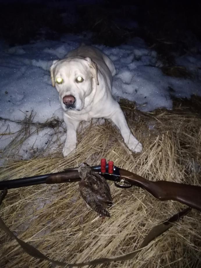 во время открыли. и погода под стать. вчера сил не хватило после работы ехать. а сегодня пораньше в деревню приехал. пока то, да сё, в пятом часу пошел не спеша к заветной полянке на краю леса. на зады только вышел, кобель по большой нужде сел, а я смотрю куропатки пара выбежали на дорогу и бегут)) одна вправо нырнула в траву, а вторая бежит дальше. кобель увидел, скулит)) вроде дернулся бежать, а дело то не доделал)) и так вот полусидя припустился, на ходу @овно теряя)) да с лаем)) иду и думаю- зимой заяц, если дорогу перебежит, пока едешь на охоту, то считай можно разворачиваться, а тут куры... дикие. а красота ж вокруг, снега мало уже, весна. в сосняк захожу и опа, сапог полон снега. ладно, пролез до полянки. в этом году деревья еще выше стали. а там зима. снег вокруг.. простоял я там до начала сумерек-тишина. а смотрю по кобелю-слышит ведь что то. решил вернуться на поляну перед сосняком, где снега нет. а там лёт уж вовсю. первого почти в ноги уронил. подранок. лабрик с живой птицей оторопел на полминуты, видимо соображал что с ней делать. аккуратно взять-она не дается, а ломать вроде как порода не позволяет)) но поймал в итоге. а второго уже в темноте взял. небо то еще более менее светлое было, увидел.