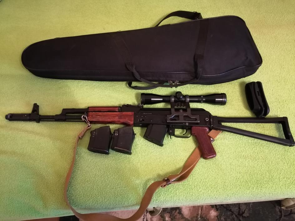 Собственно сама Сайга, загонник постоянник 4-34 с металлическим боковым кроном, три магазина на 5 патрон, пулеметный целик, галоша, погон, чехол, паспорт.