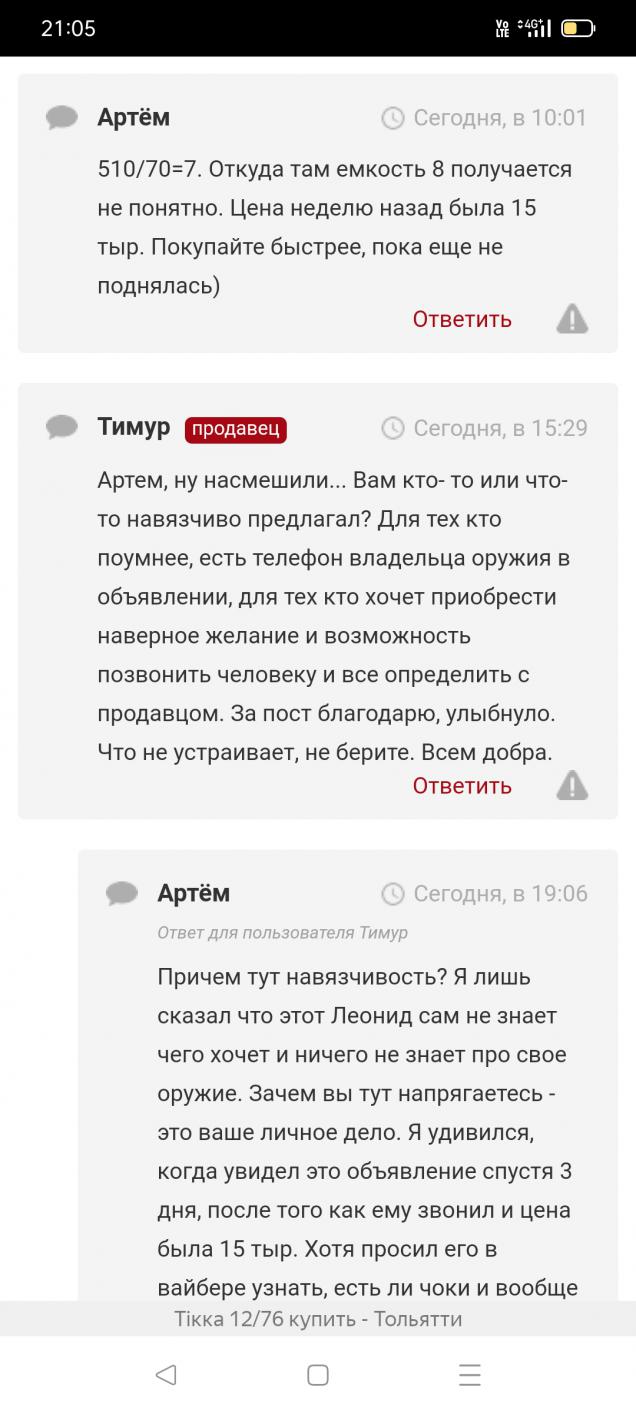 Про цену дело ВЛАДЕЛЬЦА. Не устраивает цена комплектом, берите за 15 ружье с набором для чистки. Про халяву сказл Вам ранее на ганзброкер. Цена за тикку более чем адекватная, учитывая что 20 за комплект на фото. Не делай добра, не получишь *гвна. скрины с ганзброкер прикрепил для понимания у людей Вашего настроя. Берите бригант. Удачи в покупке. |