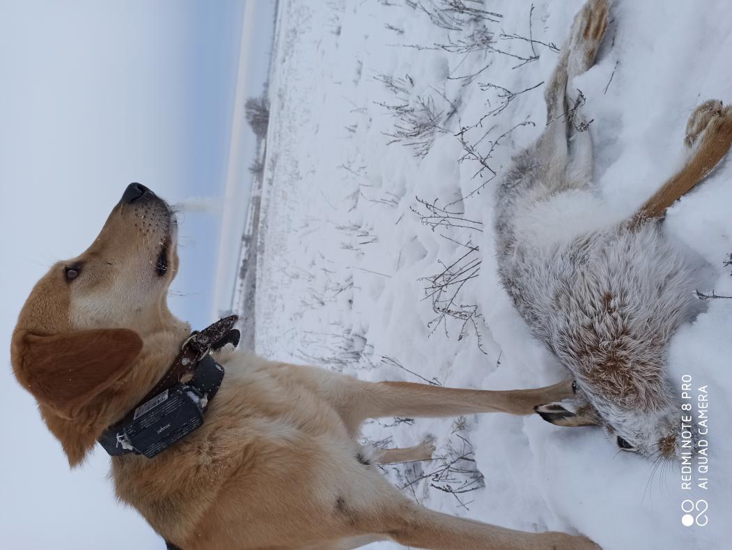 Снега почти нет, но решили пройтись по ближайшему полю и вдол ьпосадок, за полчаса подняли двух. По первому промазали, лежал в плотной траве, не были готовы, что он там будет. А второй был на краю поля за земляным бугром, у него уже шансов не было