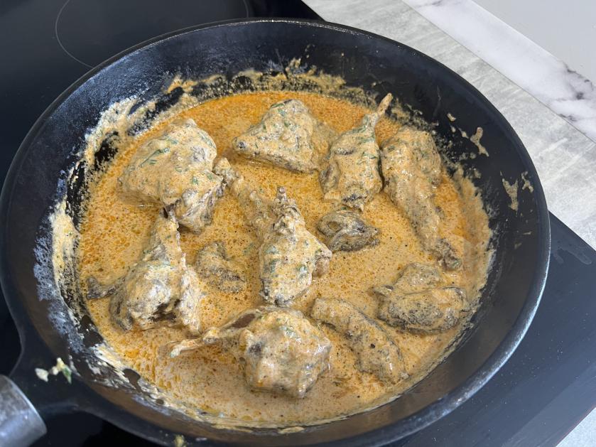 РЕЦЕПТ: Мясо режем на небольшие кусочки - обжариваем 15-20 мин., после добавляем воды 200 гр. и тушим 30-40 мин. на медленном огне. Мясо убираем в тарелку, в сковороде обжариваем чеснок и вливаем сливки. Доводим до кипения и убавляем жар. Через 5-7 мин. добавляем зелень и специи и через 10 мин. выкладываем нашу утку. Тушим помешивая 15-20 мин., периодически поливая эти соусом.
