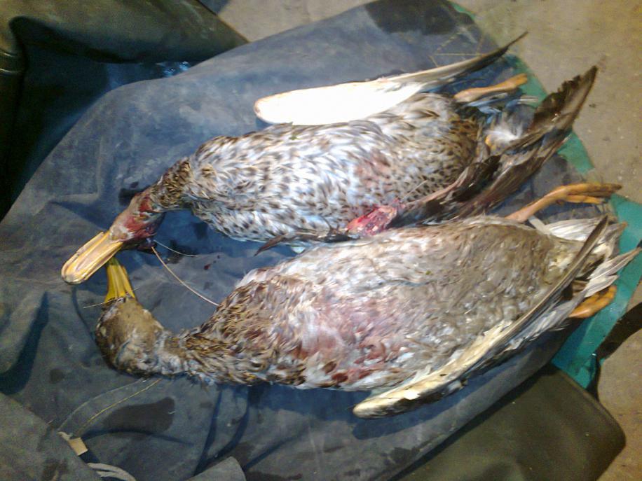 Всем доброго времени суток. После неудачного выхода в четверг дороги заметно просохли. Сегодня решил попробовать проскочить на заветное озерцо, где охотничал два года назад (в прошлом оно пересохло). Про это озерцо мало кто знает. И оно меня не подвело. Пришел, встал а вокруг красота. Минут 30 простоял как впереди меня метрах в 25 с истошным крыком поднялась утка. Я аж растерялся. Ровно в 18:35 на горизонте показались знакомые силуеты, а потом и свист крыльев. Приближались быстро и уверенно, значит они родные, значит ко мне. Круг, второй, третий дальше ждать не стал - выстрел. Первый комом на воду, утки резко набирают высоту. Второй - еще один падает, но замечаю что сделал подранка и переключаюсь на него. А он с испугу плывет прямо на меня. Не доплыл буквально два метра, развернулся и деру. На нужной дистанции третий выстрел и все кончено. Дальше ждать не стал заведомо зная что стая больше не придет минимуи дня два. Красота, впечатлений вагон и маленькая тележка. У обоих утей зобики до отказа забиты ряской.