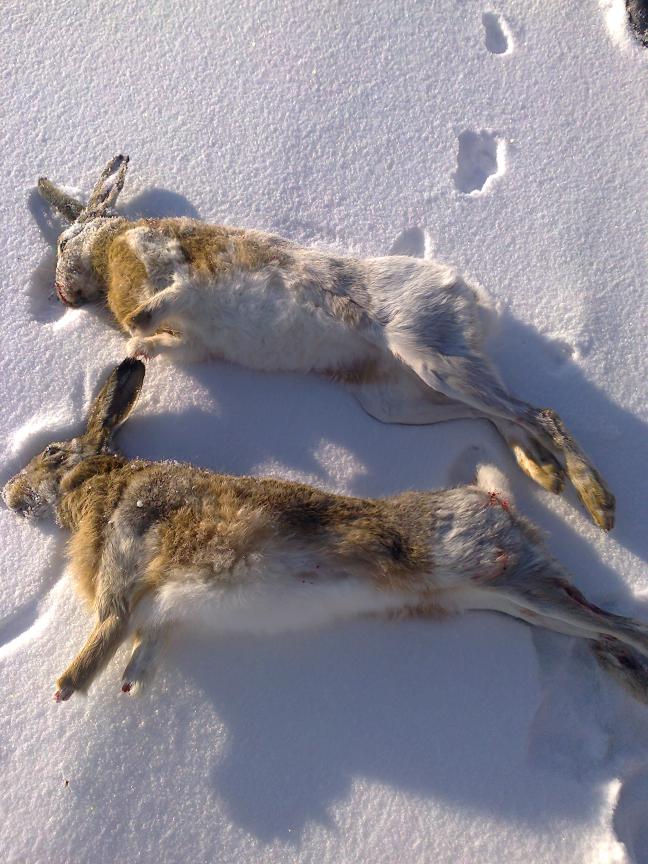 Сегодня объединили усилия с форумчанином C@LMAR (рад знакомству, надеюсь еще увидимся). Результат так сказать налицо. Свежий снежок дал о себе знать. Заячий малик как печатный. Только съехали с дороги и сразу двоечка и скидочка в пашню. Решаем искать. Пройдя метров 150 ухатый поднимается в 10 метрах от нас и переходит в нашу копилку . На часах 08:20, весь день еще впереди. Решаем проехать дальше. Проезжаем метров 70, не больше и видим свежую жировку, но видимо пока раскладывались и заряжались косой благополучно свинтил. Ставим собак и начинаем гонять. Мой Бушуй категорически отказался работать в паре с Лехиным Марсом. Вдвоем доходят до первой скидки и возвращаются. Пришлось идти самим. Косой напутав в овраге перешел лесополосу (мы его перевидели на выходе) и скрылся в лощине, а дальше видимо пройдя низинкой благополучно вышел Лехе за спину и мирно за ним наблюдал , а затем после выстрела благополучно скрылся. Вобщем худо бедно нашли и подняли мы его на краю оврага в небольшой посадке. Собакен взяв след (три раза распутав зайкины хитрости) выгнал его на круг, где зайка был добыт. Вот один собакен работает, а смычком ну никак не хочет. На часах 12:20. Попили Лехиного кофейку , зачехлили ружья и решили проехать по угодьям, глянуть места обитания заек. После чего благополучно распрошались. Погодка сегодня была просто чудо, удовольствия вагон и приятный гул в ногах тоже присутствует. Охота состоялясь
