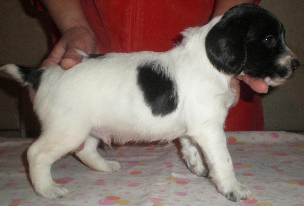 Он белый с черным и есть еще трех цветка, остальные черно-пегие. Три суки и четыре кобелька.