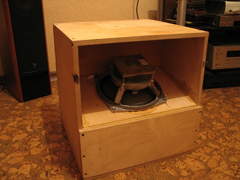 Лот №1. Саббуфер - фазоинверторный изобарик на двух головках 75 ГДН. Корпус расчитывали на компьютере. В общем сделан по уму. До чистовой отделки руки не дошли. Стоит уже года 4 без дела. Хотя года 2 исправно выполнял свою роль в составе домашнего кинотеатра. Были мысли поменять динамики на более чувствительные импортные (типа Перлис) но видно не судьба. Естественно встроенного усилителя нет.