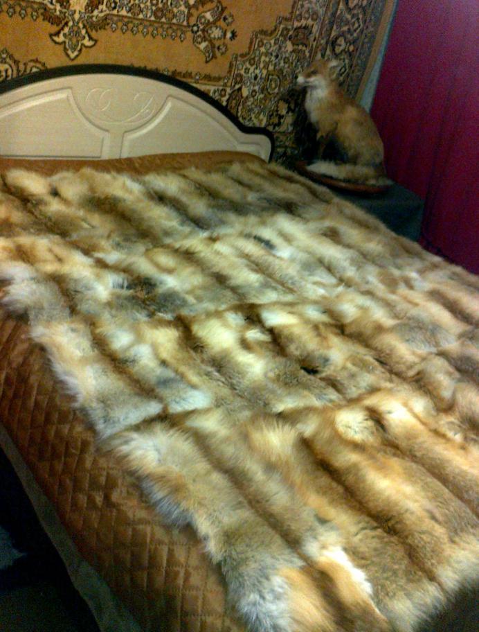 Видел у одного охотника покрывало на 2-х спальную кровать только из спинок лис,собранных в рисунок и оттороченное по периметру хвостами.Полный .....Жалко фотоап. с собой не было.