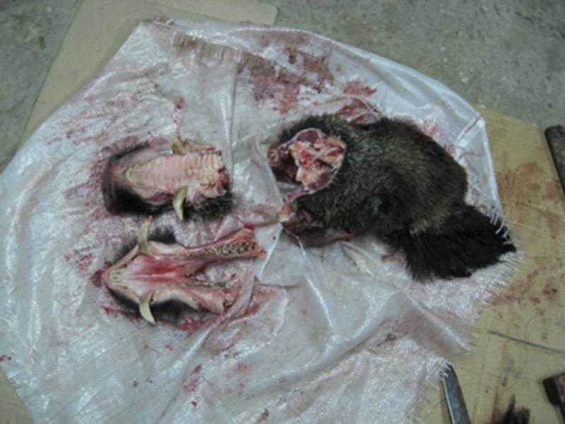 - Хочу порекомендовать начинающим охотникам "трофейщикам", как лучше !! Не буду говорить ((правильнее)) правильно у всех по разному, срубать клыки... -голову переворачиваем, извлекаем язык -вставляем палку между нижней и верхней челюстью, чтобы при рубке зубы не сломались друг о друга. -начинаем с нижних клыков, срубаем нижнюю челюсть, отделяем -подставляем что то, под верхнюю челюсть и рубим краем топора (верхняя часть - хрящ) -срезаем лишнюю мякоть. |