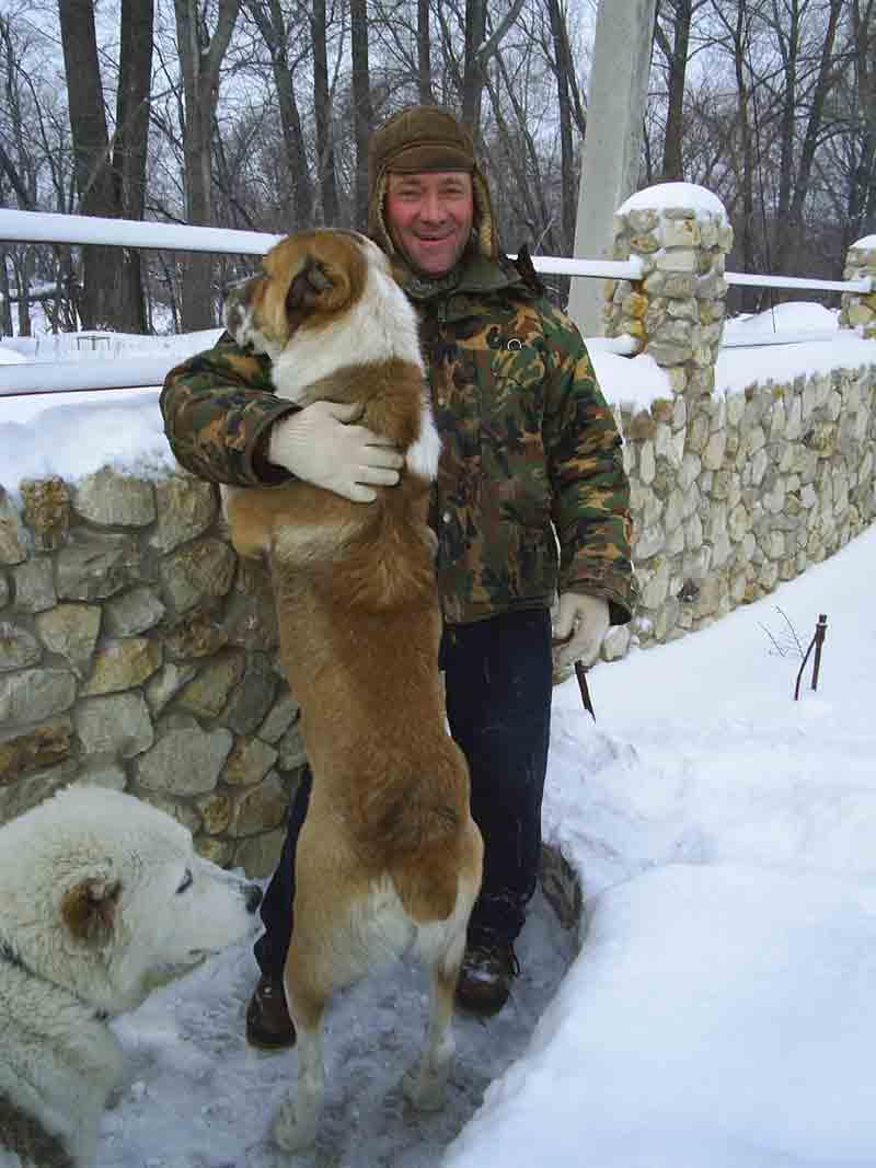У меня кавказец бы я с ним замучился вымахал лошадь, не слушается, жена гулять пошла, поводок накрутила чтобы не вырвался. он увидел србаку как понес, ее по земле протащил чуть руку не оторвал_____я его в хорошие руки!! Алабаи очень умные (не имею в виду команды служебные) Этот у меня третий и ни один из трех, ни разу не укусил людей. На фотке отец с первыми, 2000 год.