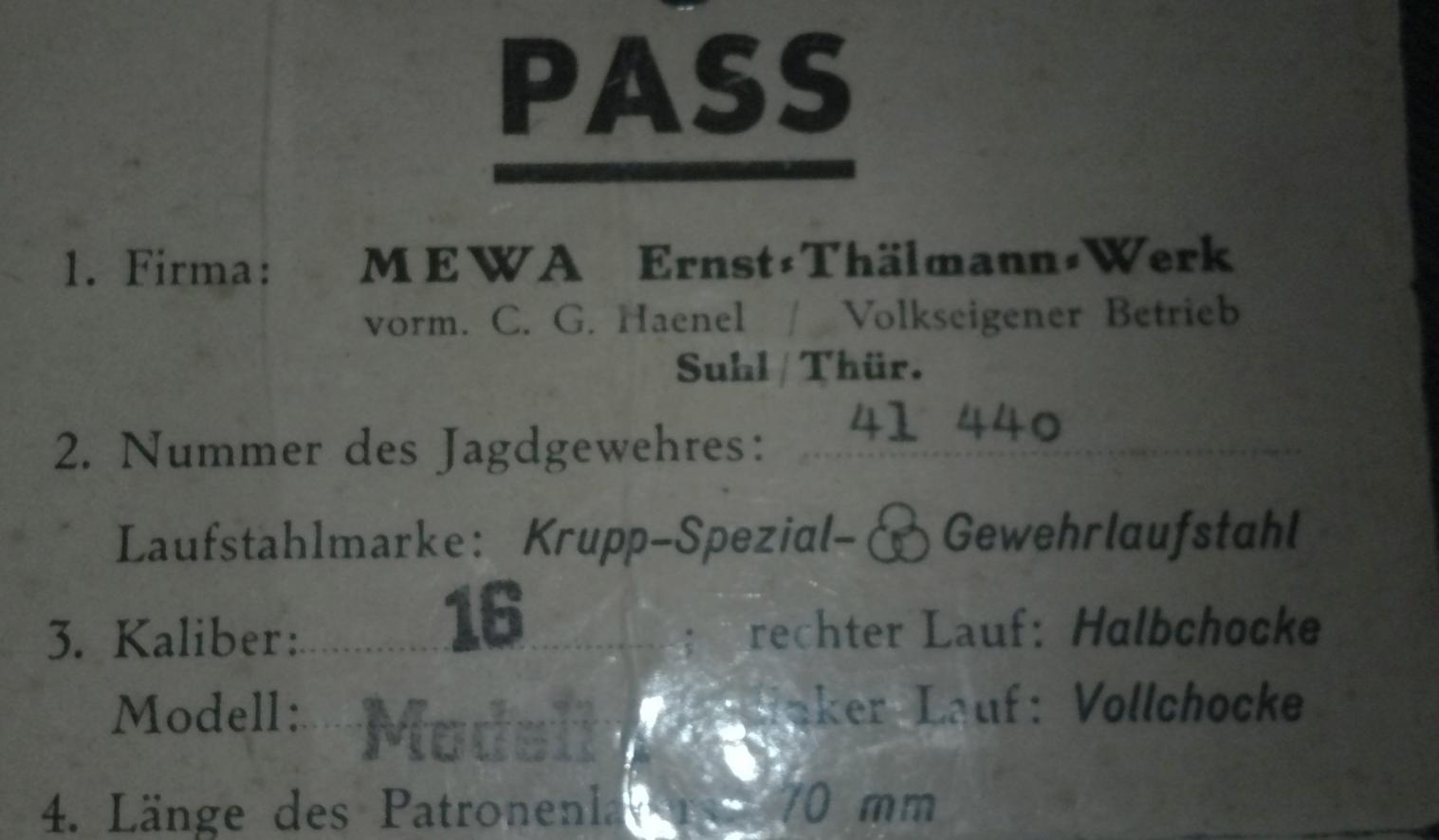 Ружье производства велосипедной фабрики ГДР. НО!, почти на 100 % из комплектующих довоенного производства, т.е. западной германии. . Учитывая наличие оригинального паспорта и Вашего утверждения об "отличном состоянии" - может стоить неплохих денег. Фото (общий вид, все клейма, лоб колодки и т.д.) упростят вопрос для всех.