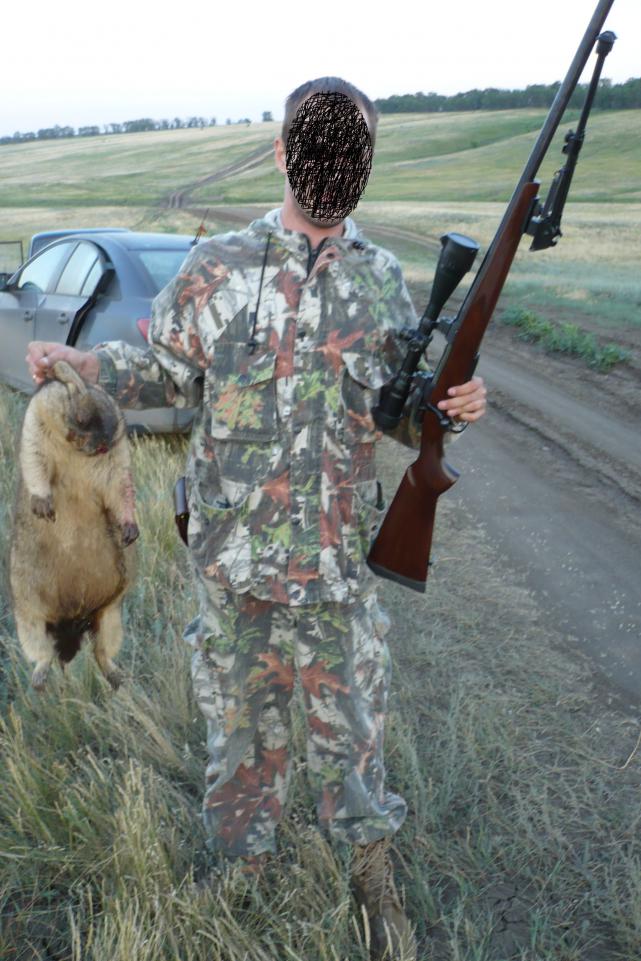 Ну вот и мне свезло маленько. 43 метра, стоял мордой ко мне в траве, целил в белые зубы, попал в ноздрю. Лег сразу, 6 кг 300 г.